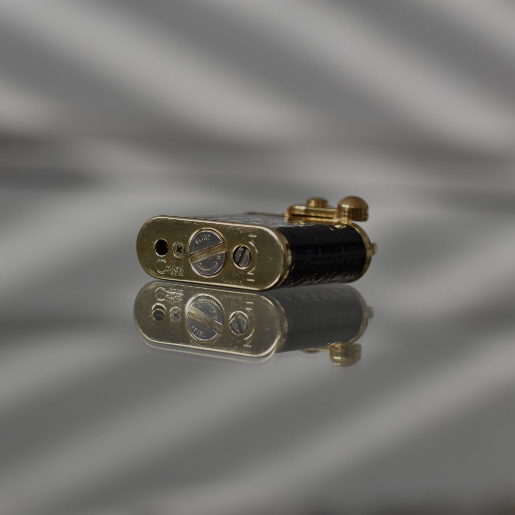 Replika, którą dostałem działa bez zarzutów. Myślę, że została poddana gruntownej renowacji. Mistrz zna się na tym jak nikt inny i wierzę, że jeśli wyszła spod jego ręki, posłuży mi na lata. Zapalniczka jest na gaz i posiada bardzo intrygujący system pocierania kamienia, który działa na zasadzie sprężyny. Po naciągnięciu i otwarciu zaworka z gazem, na powrocie pocierany jest kamień, który daję iskrę zapalającą gaz. Na spodzie znajduje się regulacja płomienia i kamienia. Również na spodzie znajduje się zawór do uzupełnienia gazu. Bardzo podoba mi się zestawienie kolorów – czarny korpus z błyszczącej, lakierowanej skóry, która wygląda trochę jak krokodyla, ze złotymi elementami. Moim zdaniem idealne zestawienie kolorów! Czarny i złoty wyglądają ze sobą niezwykle elegancko – dostojnie wręcz!